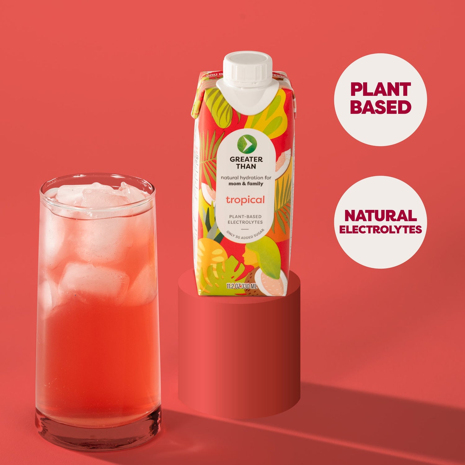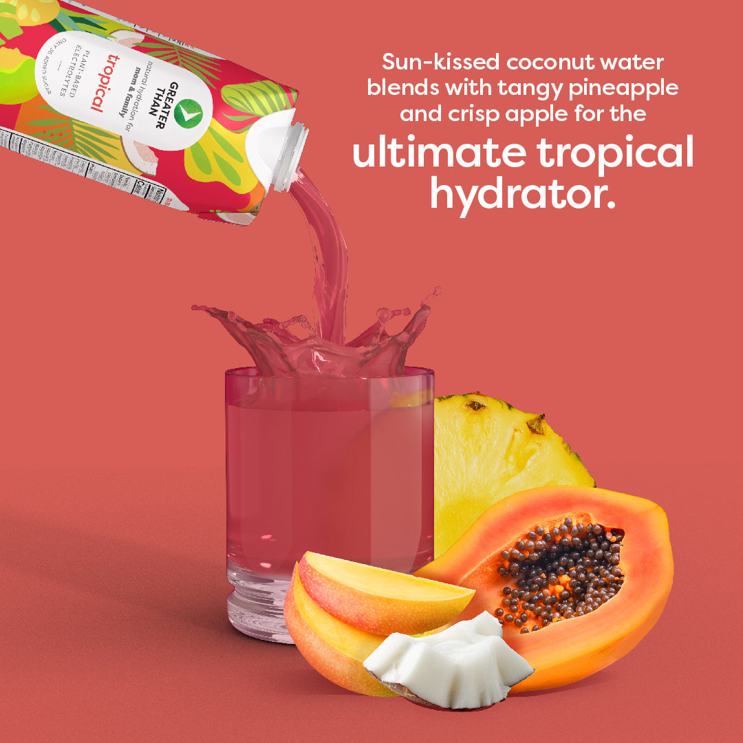 Escape to paradise with our Tropical flavor, a refreshing blend of natural fruit juices and coconut water. Packed with essential vitamins, minerals, and electrolytes, this delicious drink is the perfect way to stay hydrated and energized, naturally. Greater Than is a healthier alternative to traditional electrolyte drinks, perfect for the whole family.